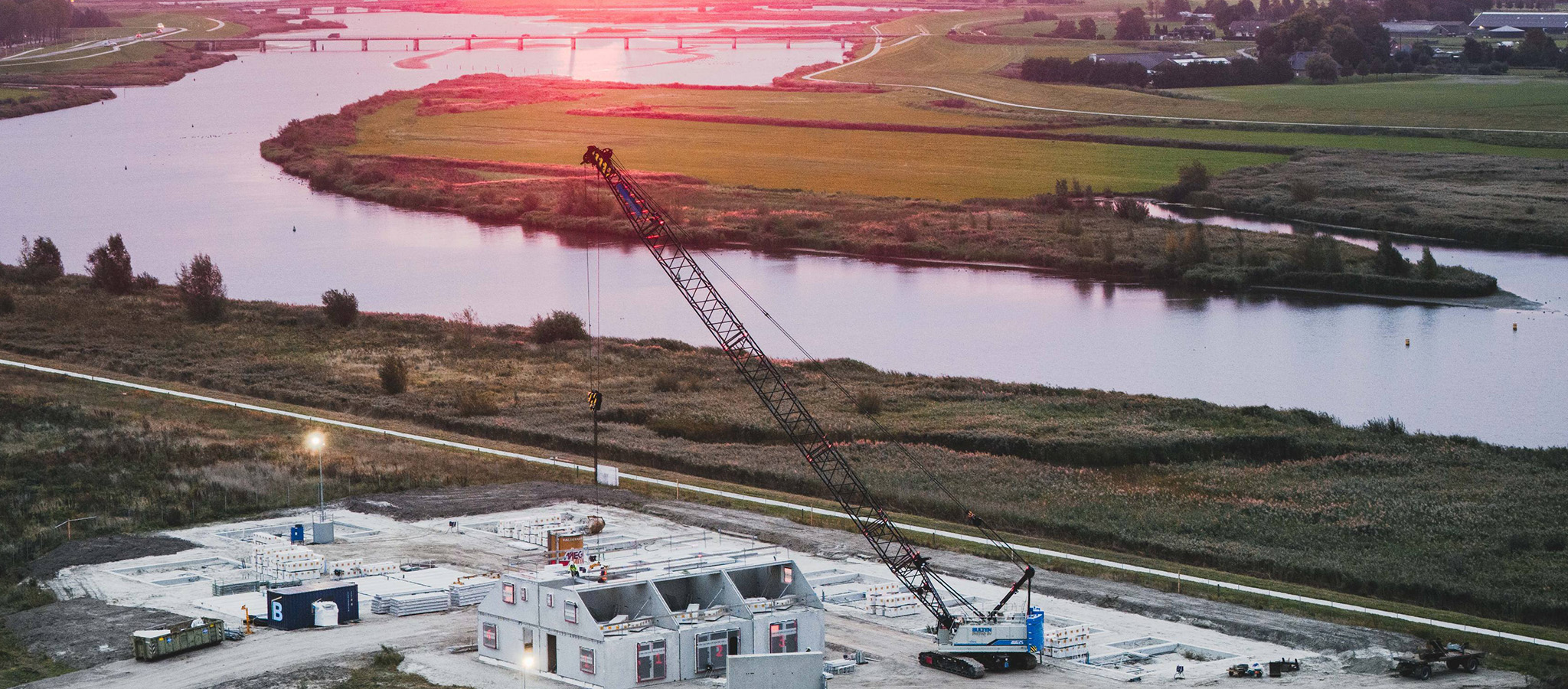 Tijdens deze prachtige zonsondergang nemen we een kijkje op de Werven fase 2. In deze bouwupdate van oktober zien we dat de eerste contouren van de woningen er staan en de eerste woningen al worden opgebouwd. De begane grond en eerste verdieping van de rug-aan-rug woningen (bouwnummer 1 tm 6) zitten er al op.